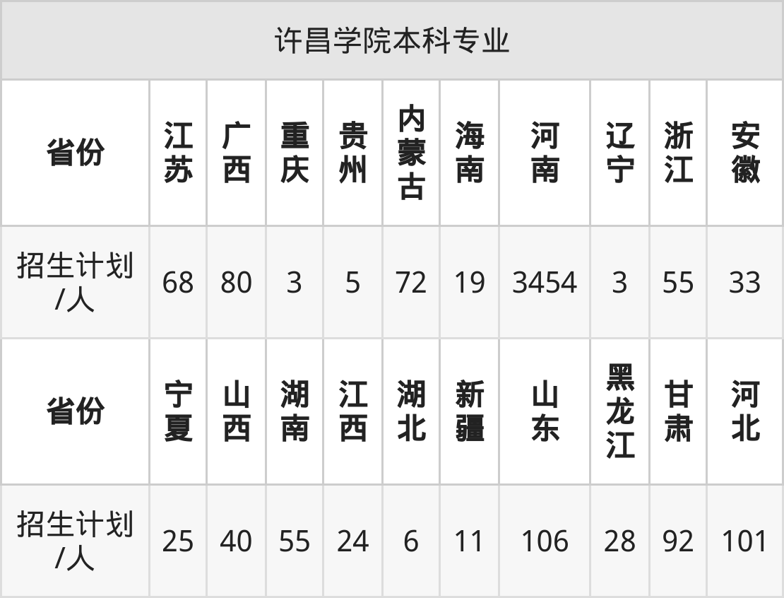 许昌学院面向河北(101人)、甘肃(92人)、宁夏(25人)、内蒙古(72人)、河南(3454人)、湖北(6人)、江苏(68人)等20个地区开展本科招生。其中新疆、内蒙古、河南招生批次为本科二批,其余省份为本科批。