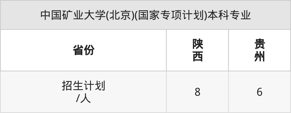 中国矿业大学(北京)(国家专项计划)面向陕西(8人)、贵州(6人)开展本科招生。招生批次为本科一批。