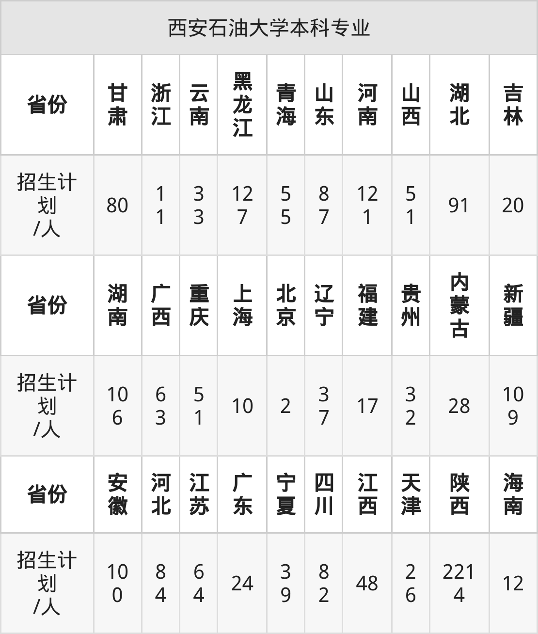 西安石油大学面向安徽(100人)、甘肃(80人)、广西(63人)、辽宁(37人)、贵州(32人)、宁夏(39人)、陕西(2214人)等30个地区开展本科招生。其中陕西、四川、河南、新疆招生批次为本科一批,其余省份为本科批。