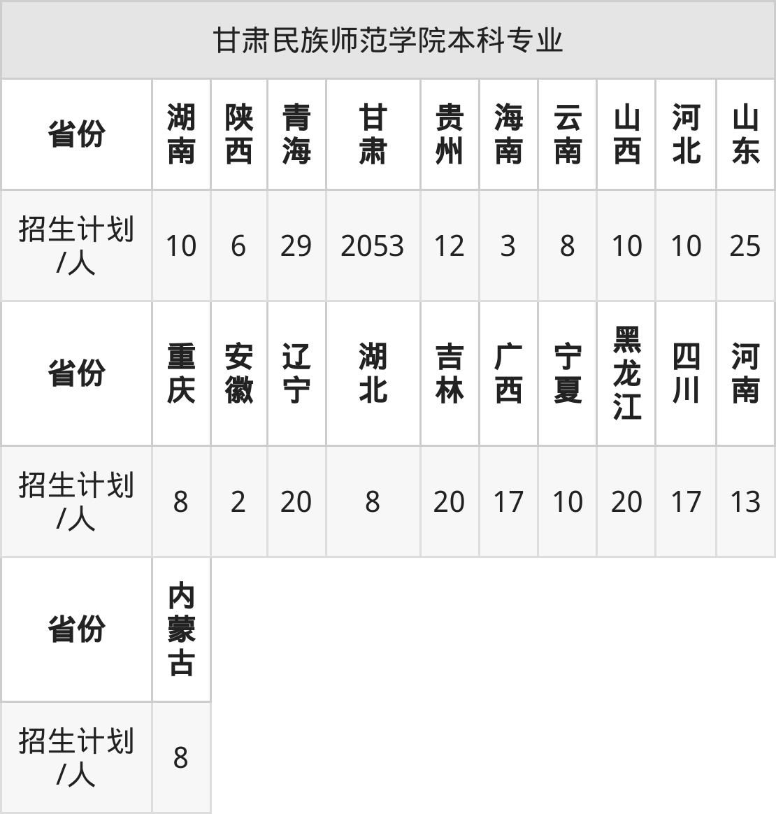 甘肃民族师范学院面向四川(17人)、广西(17人)、甘肃(2053人)、山东(25人)、山西(10人)、重庆(8人)、贵州(12人)等21个地区开展本科招生。其中宁夏招生批次为第二批本科,四川、陕西、内蒙古、河南招生批次为本科二批,其余省份为本科批。