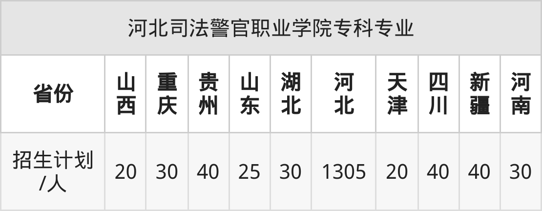 河北司法警官职业学院面向湖北(30人)、贵州(40人)、河北(1305人)、河南(30人)、山东(25人)、山西(20人)、天津(20人)等10个地区开展专科招生。其中山东招生批次为二段,其余省份为专科批。