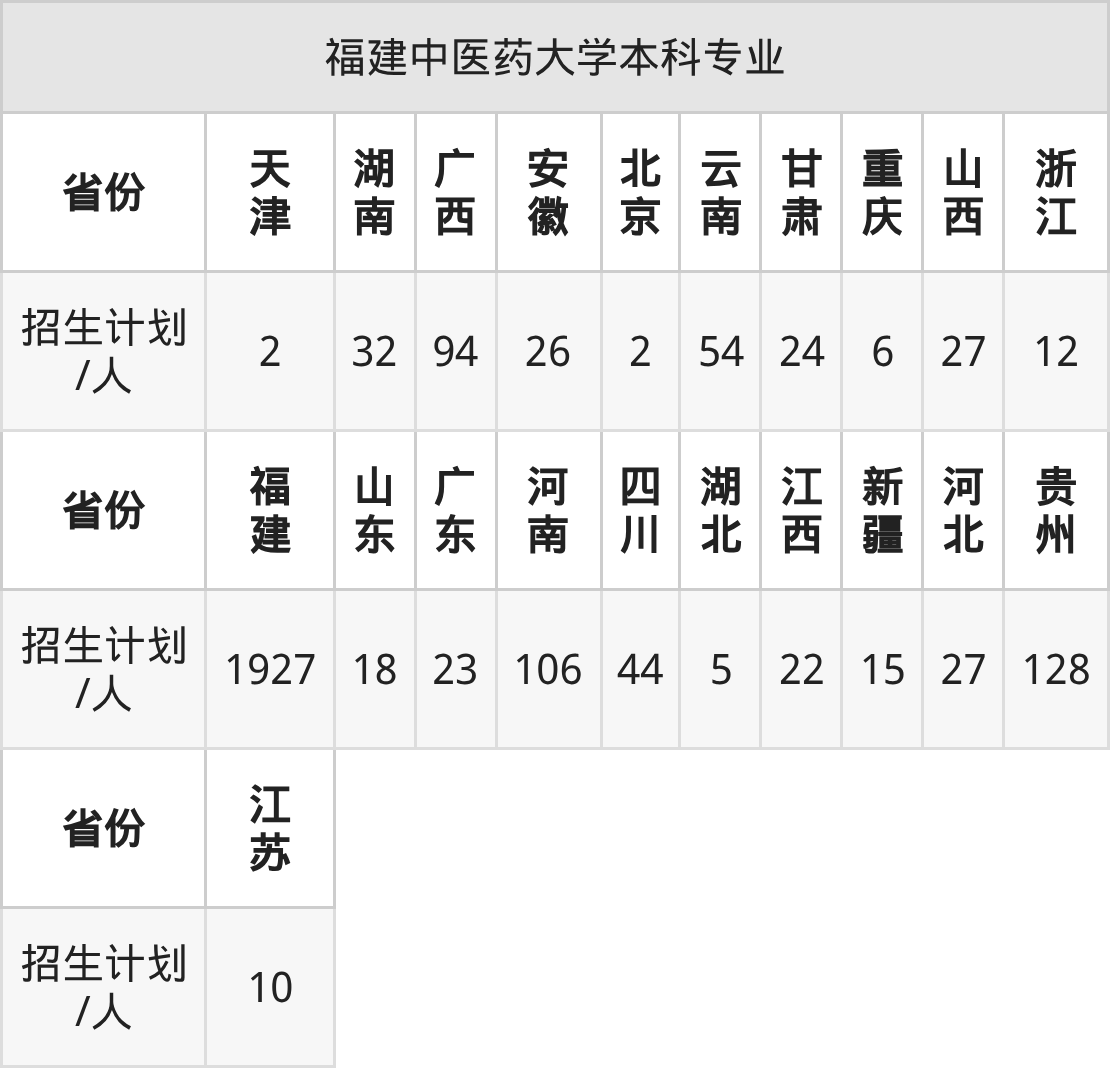 福建中医药大学面向江苏(10人)、四川(44人)、天津(2人)、山西(27人)、河北(27人)、浙江(12人)、安徽(26人)等21个地区开展本科招生。其中甘肃招生批次为本科批C段,四川、云南招生批次为本科批B段,其余省份为本科批。