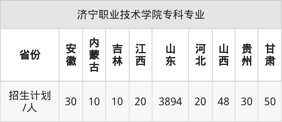 济宁职业技术学院面向吉林(10人)、山西(48人)、贵州(30人)、安徽(30人)、内蒙古(10人)、甘肃(50人)、江西(20人)等9个地区开展专科招生。其中山东招生批次为二段,其余省份为专科批。
