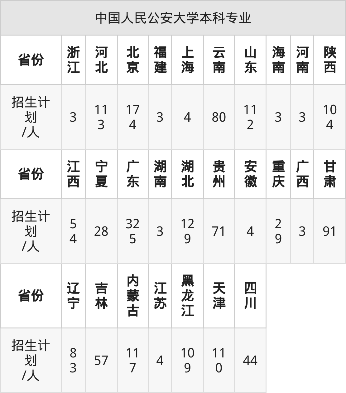 中国人民公安大学面向广东(325人)、甘肃(91人)、黑龙江(109人)、北京(174人)、上海(4人)、辽宁(83人)、重庆(29人)等27个地区开展本科招生。其中河南招生批次为本科一批,河北、甘肃、重庆、贵州、内蒙古招生批次为本科提前批A,宁夏、四川、云南、湖北、江西、陕西招生批次为本科提前批,其余省份为本科批。