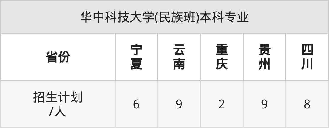 华中科技大学(民族班)面向云南(9人)、重庆(2人)、贵州(9人)、四川(8人)、宁夏(6人)开展本科招生。其中云南招生批次为一本,其余省份为本科批。