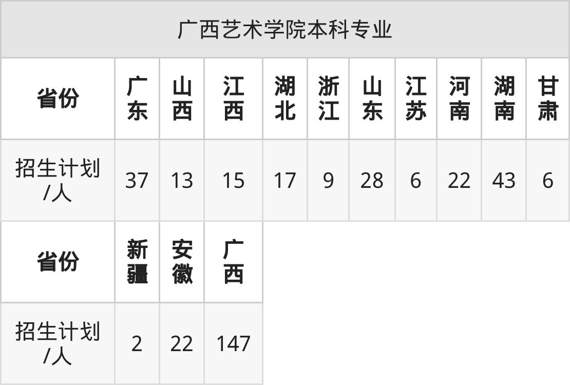 广西艺术学院面向甘肃(6人)、湖北(17人)、山西(13人)、浙江(9人)、安徽(22人)、广西(147人)、江西(15人)等13个地区开展本科招生。其中新疆、河南招生批次为本科二批,其余省份为本科批。