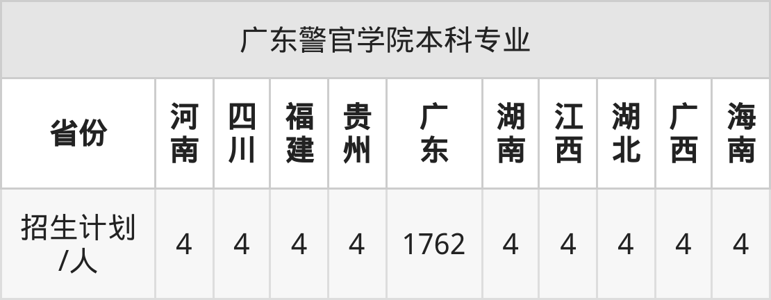 广东警官学院面向湖北(4人)、湖南(4人)、贵州(4人)、广东(1762人)、广西(4人)、江西(4人)、海南(4人)等10个地区开展本科招生。其中四川、河南招生批次为本科二批,其余省份为本科批。