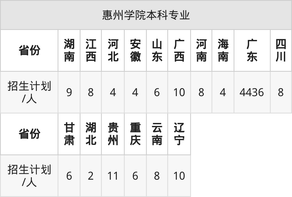惠州学院面向四川(8人)、河南(8人)、山东(6人)、重庆(6人)、贵州(11人)、河北(4人)、广东(4436人)等16个地区开展本科招生。其中山东招生批次为一段,四川、河南招生批次为本科二批,其余省份为本科批。