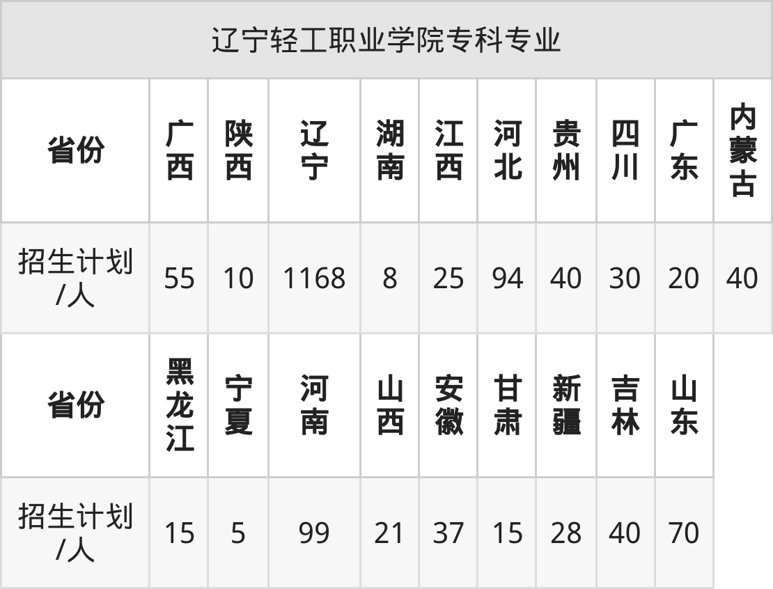 辽宁轻工职业学院面向湖南(8人)、宁夏(5人)、新疆(28人)、甘肃(15人)、贵州(40人)、四川(30人)、黑龙江(15人)等19个地区开展专科招生。其中山东招生批次为二段,其余省份为专科批。