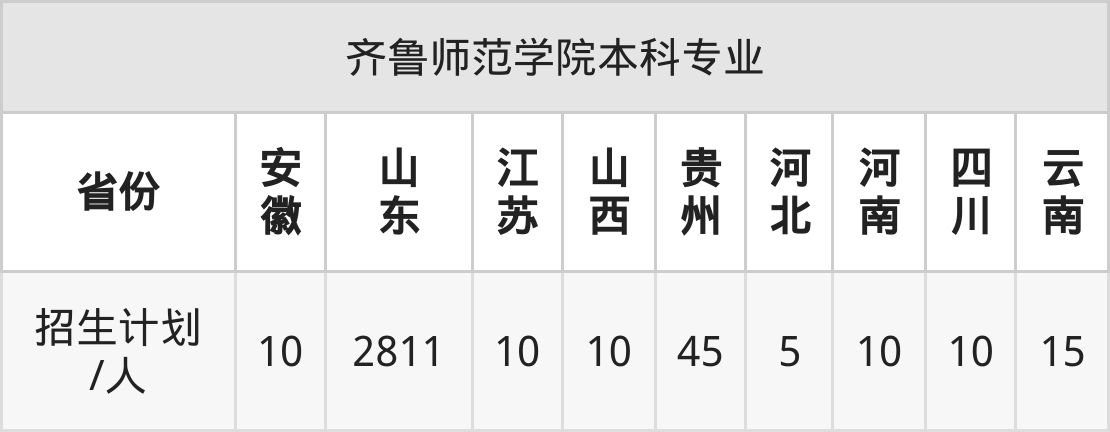 齐鲁师范学院面向安徽(10人)、江苏(10人)、云南(15人)、山东(2811人)、河北(5人)、山西(10人)、河南(10人)等9个地区开展本科招生。其中山西招生批次为第二批本科A类,河南、四川招生批次为本科二批,其余省份为本科批。