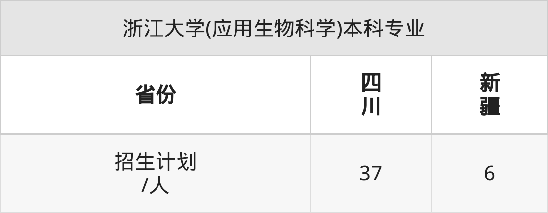 浙江大学(应用生物科学)面向四川(37人)、新疆(6人)开展本科招生。招生批次为本科一批。