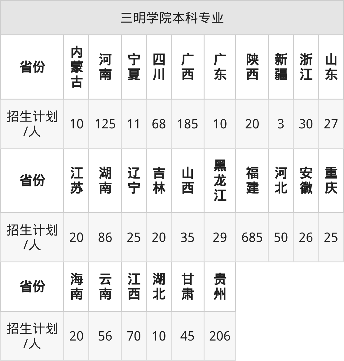 三明学院面向海南(20人)、四川(68人)、内蒙古(10人)、河北(50人)、山西(35人)、重庆(25人)、新疆(3人)等26个地区开展本科招生。其中山西招生批次为第二批本科B类,四川、新疆、内蒙古、陕西、河南招生批次为本科二批,其余省份为本科批。