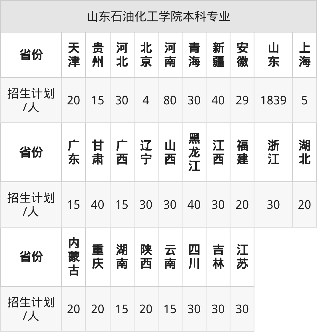 山东石油化工学院面向上海(5人)、贵州(15人)、青海(30人)、山东(1839人)、湖北(20人)、福建(20人)、广东(15人)等28个地区开展本科招生。其中山西招生批次为第二批本科B类,陕西、新疆、河南、四川、内蒙古招生批次为本科二批,其余省份为本科批。