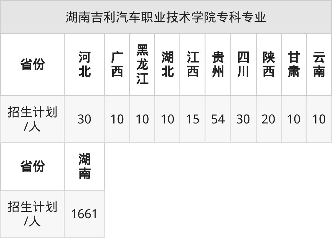 湖南吉利汽车职业技术学院面向四川(30人)、甘肃(10人)、湖南(1661人)、河北(30人)、江西(15人)、贵州(54人)、广西(10人)等11个地区开展专科招生。招生批次为专科批。