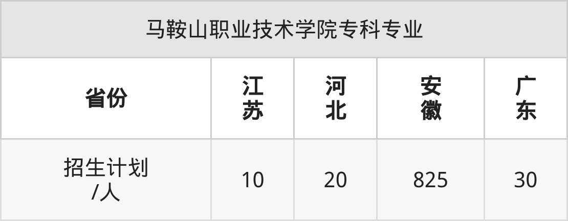 马鞍山职业技术学院面向江苏(10人)、河北(20人)、安徽(825人)、广东(30人)开展专科招生。招生批次为专科批。