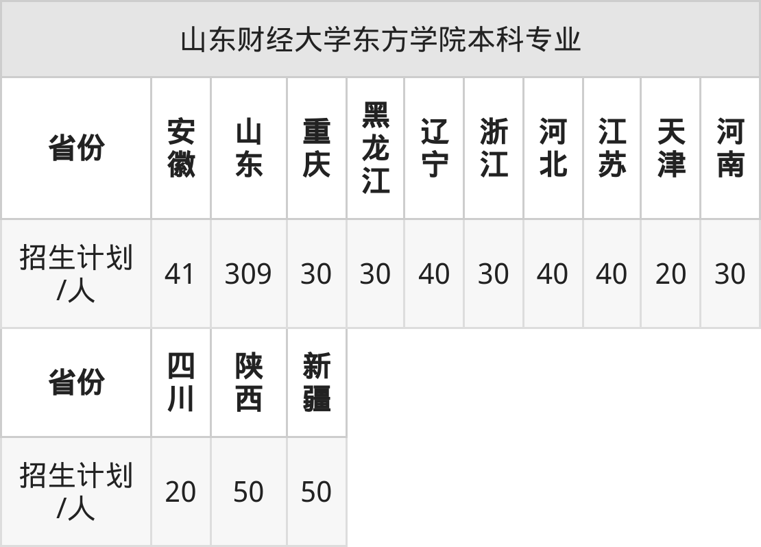 山东财经大学东方学院面向黑龙江(30人)、陕西(50人)、新疆(50人)、河北(40人)、重庆(30人)、天津(20人)、浙江(30人)等13个地区开展本科招生。其中山东招生批次为一段,河南、新疆、四川、陕西招生批次为本科二批,其余省份为本科批。
