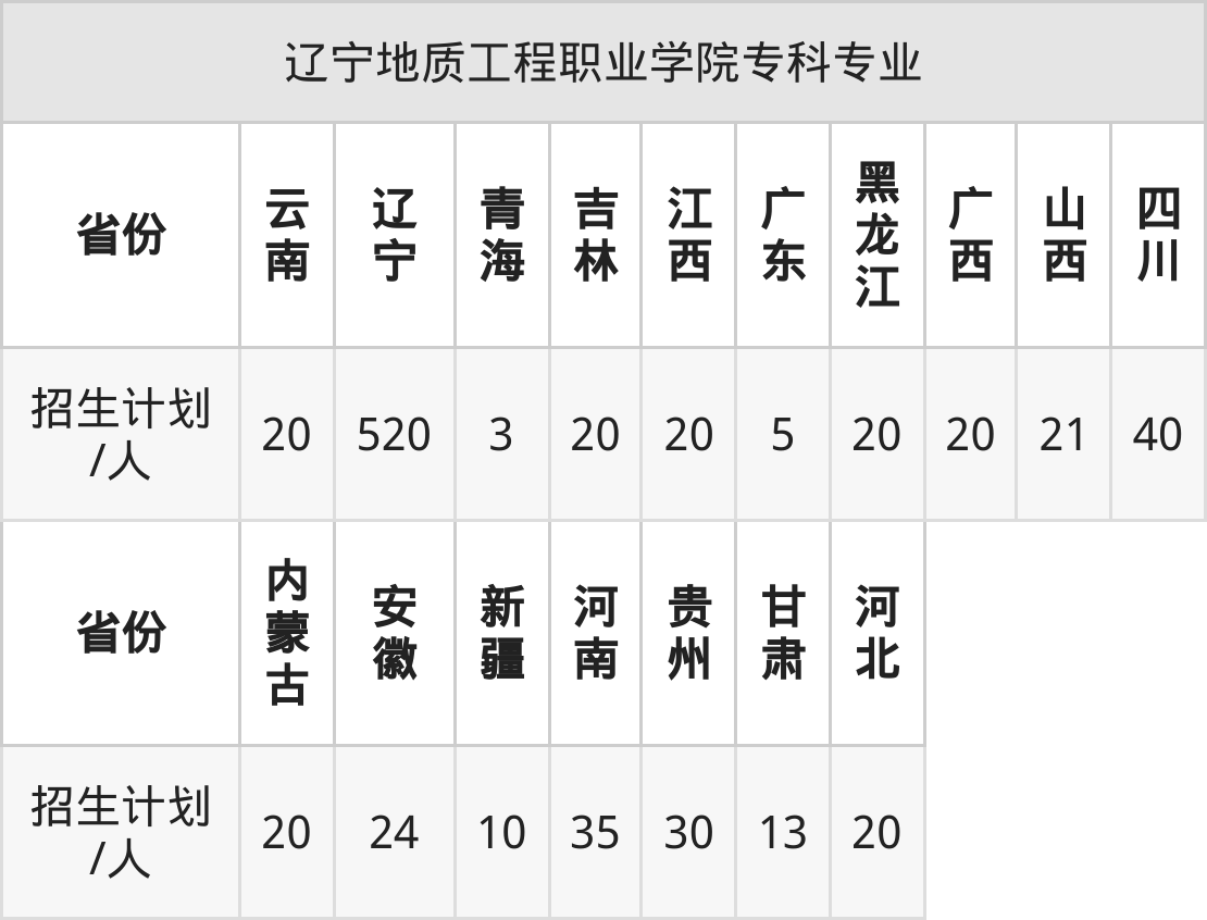 辽宁地质工程职业学院面向新疆(10人)、吉林(20人)、江西(20人)、贵州(30人)、四川(40人)、甘肃(13人)、黑龙江(20人)等17个地区开展专科招生。招生批次为专科批。