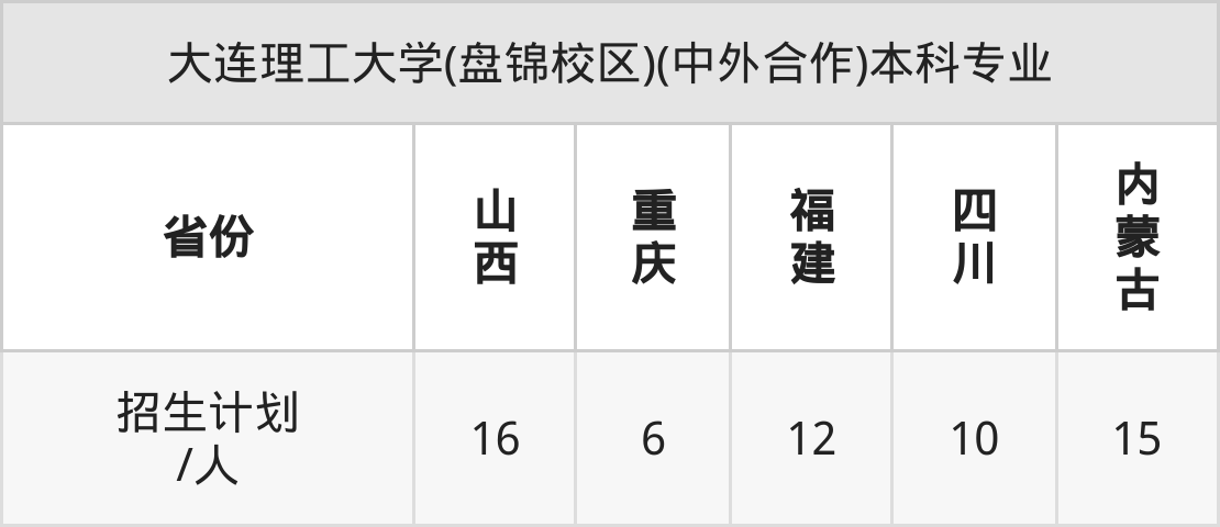 大连理工大学(盘锦校区)(中外合作)面向福建(12人)、四川(10人)、内蒙古(15人)、山西(16人)、重庆(6人)开展本科招生。其中山西招生批次为第一批本科A1类,其余省份为本科批。