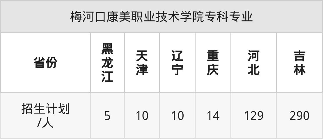 梅河口康美职业技术学院面向吉林(290人)、黑龙江(5人)、天津(10人)、辽宁(10人)、重庆(14人)、河北(129人)开展专科招生。招生批次为专科批。