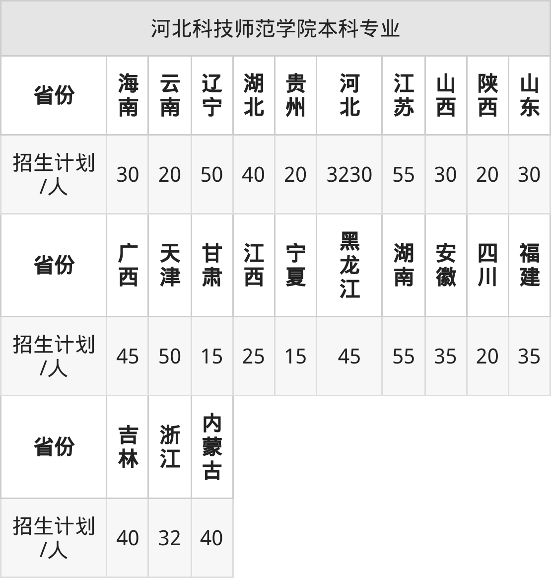河北科技师范学院面向湖北(40人)、海南(30人)、山西(30人)、安徽(35人)、天津(50人)、山东(30人)、内蒙古(40人)等23个地区开展本科招生。其中天津招生批次为本科批A段,内蒙古、四川、陕西招生批次为本科二批,其余省份为本科批。