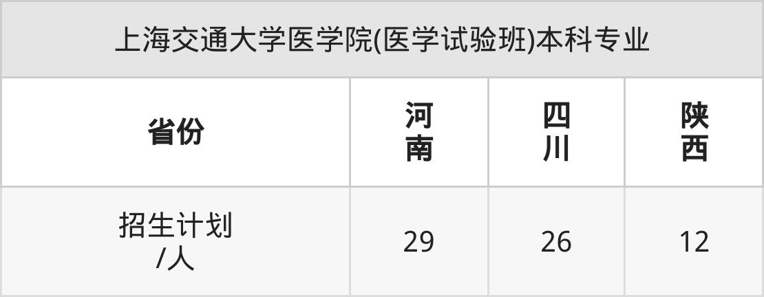 上海交通大学医学院(医学试验班)面向陕西(12人)、河南(29人)、四川(26人)开展本科招生。招生批次为本科一批。