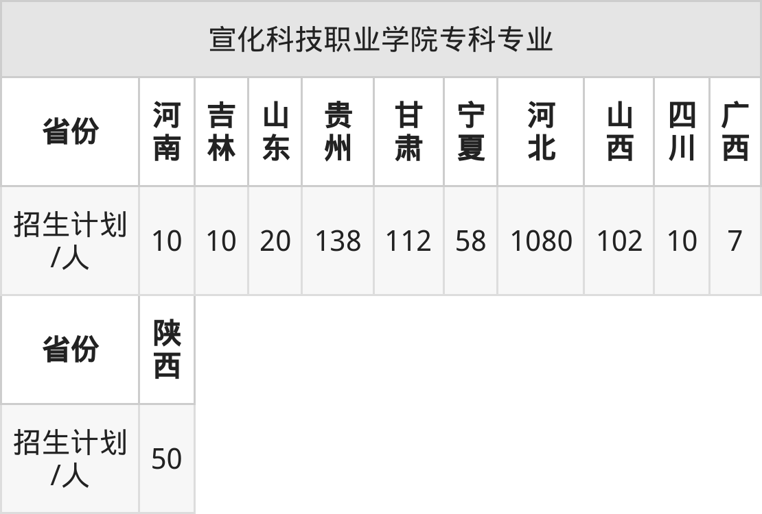 宣化科技职业学院面向河南(10人)、山东(20人)、宁夏(58人)、广西(7人)、陕西(50人)、吉林(10人)、河北(1080人)等11个地区开展专科招生。其中山东招生批次为二段,其余省份为专科批。