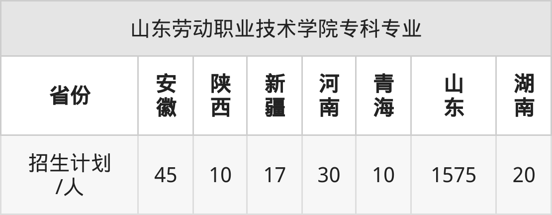 山东劳动职业技术学院面向陕西(10人)、新疆(17人)、河南(30人)、青海(10人)、山东(1575人)、湖南(20人)、安徽(45人)等7个地区开展专科招生。其中山东招生批次为二段,其余省份为专科批。