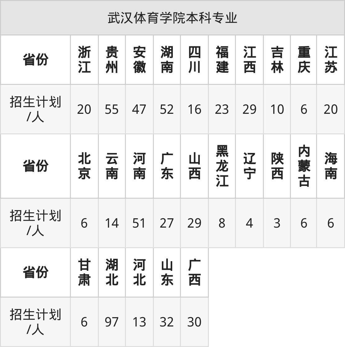 武汉体育学院面向重庆(6人)、安徽(47人)、辽宁(4人)、海南(6人)、福建(23人)、内蒙古(6人)、黑龙江(8人)等25个地区开展本科招生。其中陕西、内蒙古、河南、四川招生批次为本科二批,其余省份为本科批。
