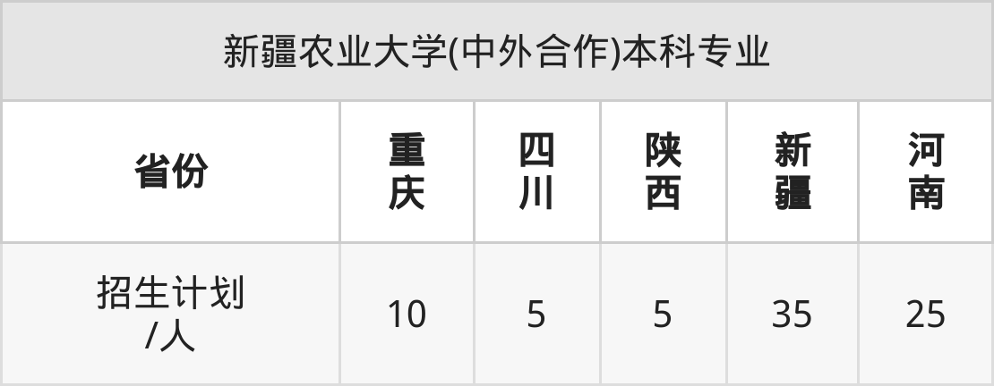 新疆农业大学(中外合作)面向河南(25人)、重庆(10人)、四川(5人)、陕西(5人)、新疆(35人)开展本科招生。其中重庆招生批次为本科批,其余省份为本科二批。