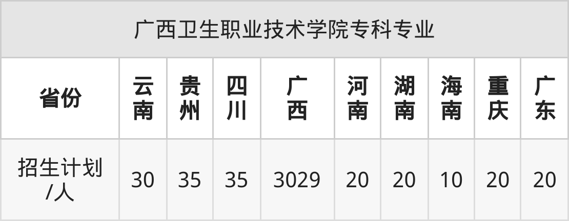 广西卫生职业技术学院面向广东(20人)、广西(3029人)、河南(20人)、云南(30人)、湖南(20人)、海南(10人)、重庆(20人)等9个地区开展专科招生。招生批次为专科批。