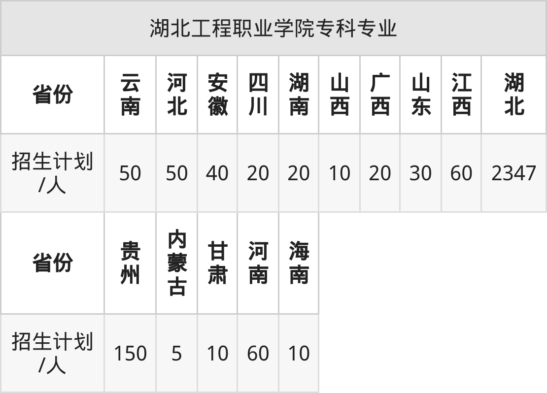 湖北工程职业学院面向山西(10人)、贵州(150人)、安徽(40人)、四川(20人)、甘肃(10人)、湖南(20人)、内蒙古(5人)等15个地区开展专科招生。其中山东招生批次为二段,其余省份为专科批。