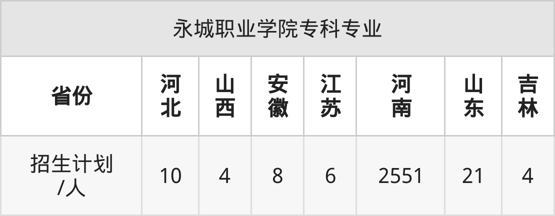 永城职业学院面向江苏(6人)、河南(2551人)、山东(21人)、吉林(4人)、河北(10人)、山西(4人)、安徽(8人)等7个地区开展专科招生。其中山东招生批次为二段,其余省份为专科批。