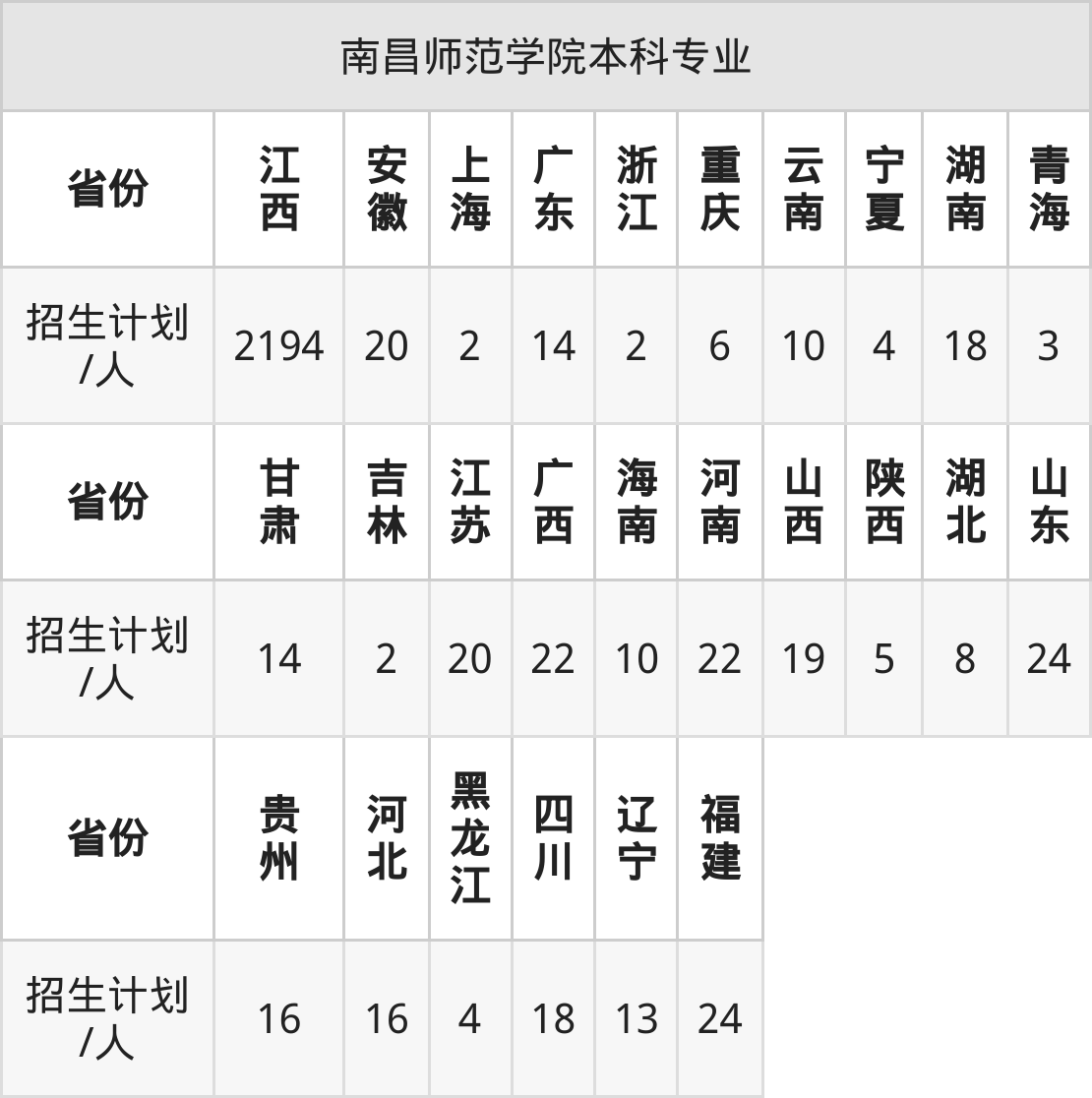 南昌师范学院面向海南(10人)、贵州(16人)、浙江(2人)、宁夏(4人)、江苏(20人)、辽宁(13人)、青海(3人)等26个地区开展本科招生。其中青海招生批次为本科一段,陕西、四川、河南招生批次为本科二批,其余省份为本科批。