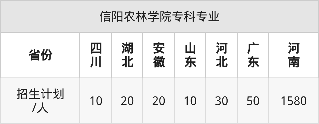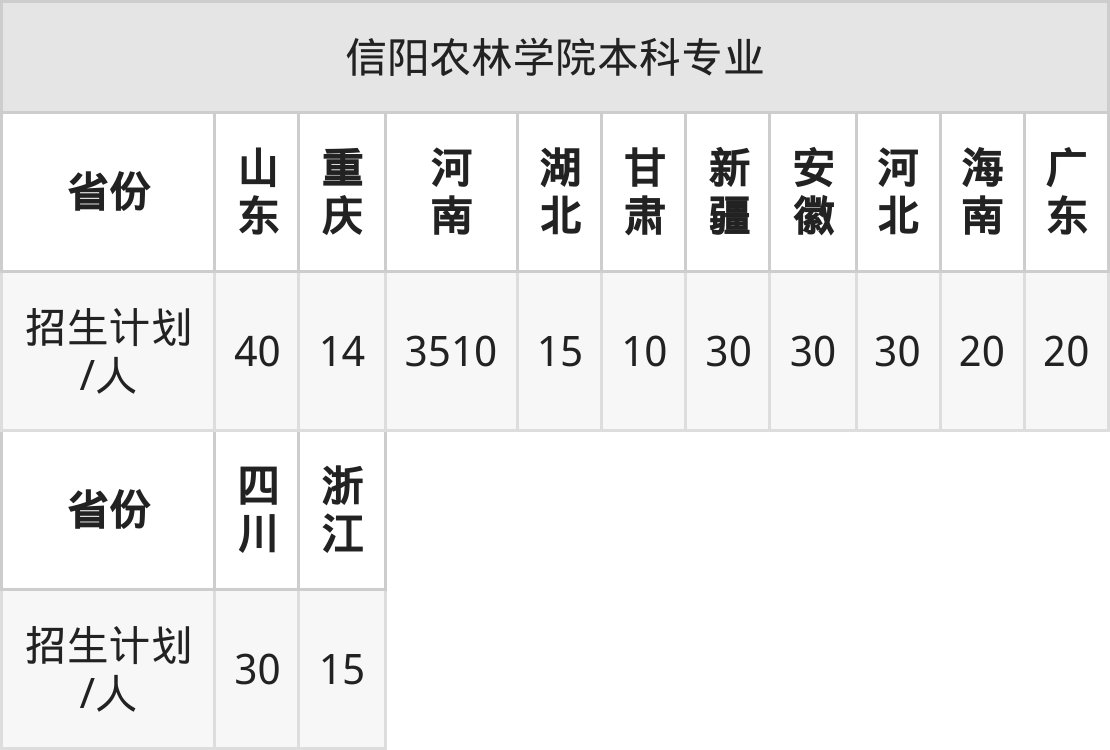 信阳农林学院面向甘肃(10人)、新疆(30人)、山东(40人)、广东(20人)、河南(3510人)、湖北(15人)、海南(20人)等12个地区开展本科招生。其中河南、四川、新疆招生批次为本科二批,其余省份为本科批。
