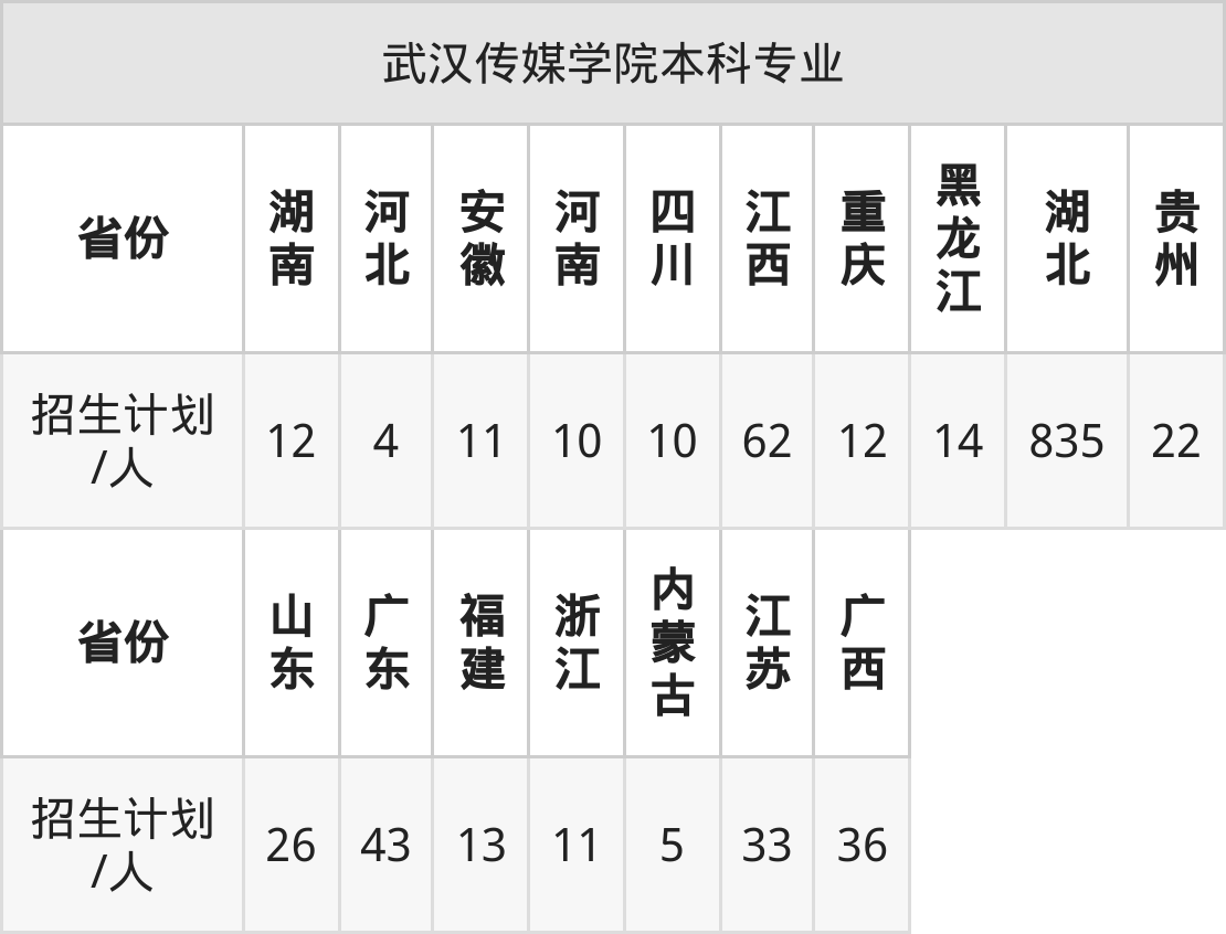 武汉传媒学院面向山东(26人)、江西(62人)、广东(43人)、黑龙江(14人)、江苏(33人)、河南(10人)、湖北(835人)等17个地区开展本科招生。其中内蒙古、河南、四川招生批次为本科二批,其余省份为本科批。