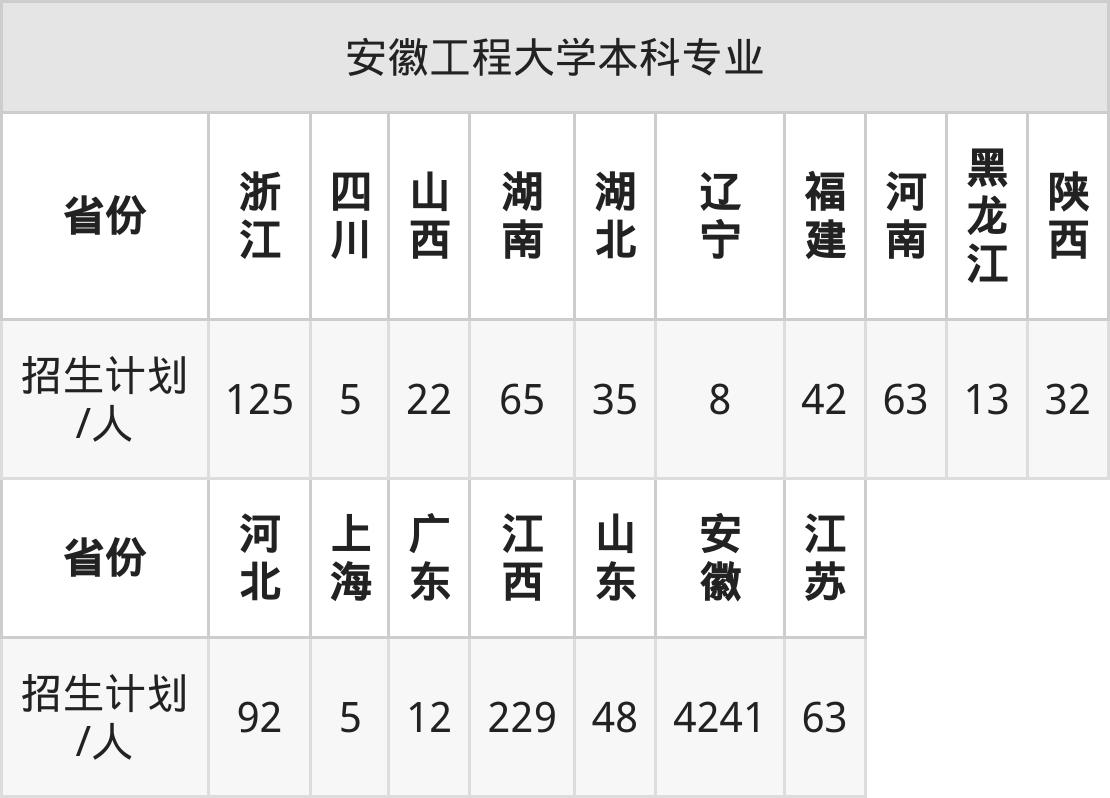 安徽工程大学面向福建(42人)、河南(63人)、江西(229人)、湖北(35人)、安徽(4241人)、广东(12人)、黑龙江(13人)等17个地区开展本科招生。其中山东招生批次为一段,四川、河南、陕西招生批次为本科二批,其余省份为本科批。