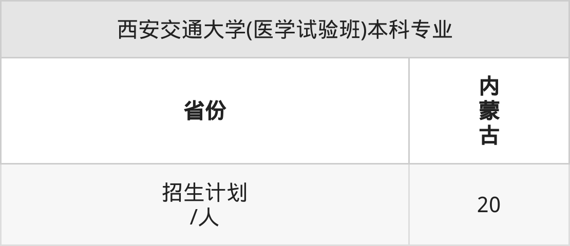 西安交通大学(医学试验班)面向内蒙古(20人)开展本科招生。招生批次为本科一批。