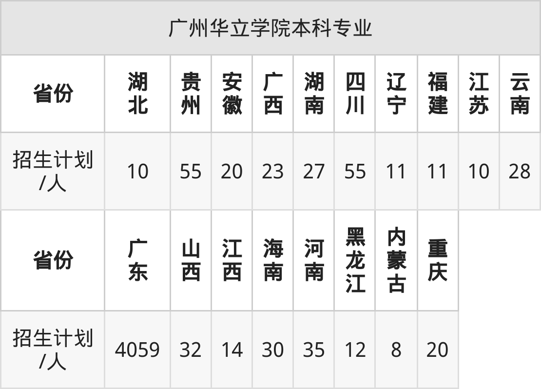 广州华立学院面向黑龙江(12人)、湖南(27人)、贵州(55人)、福建(11人)、湖北(10人)、安徽(20人)、云南(28人)等18个地区开展本科招生。其中山西招生批次为第二批本科C类,内蒙古、河南、四川招生批次为本科二批,其余省份为本科批。