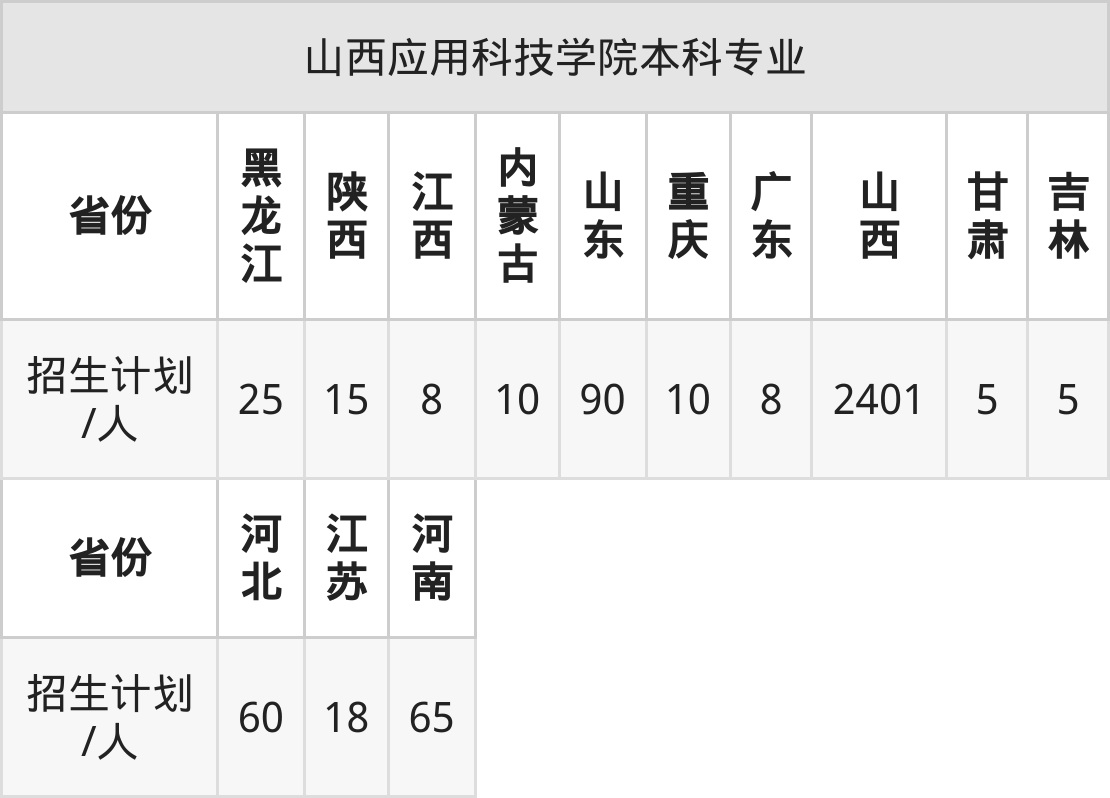 山西应用科技学院面向江西(8人)、河北(60人)、山西(2401人)、重庆(10人)、广东(8人)、内蒙古(10人)、甘肃(5人)等13个地区开展本科招生。其中山西招生批次为第二批本科C类,陕西、河南、内蒙古招生批次为本科二批,其余省份为本科批。