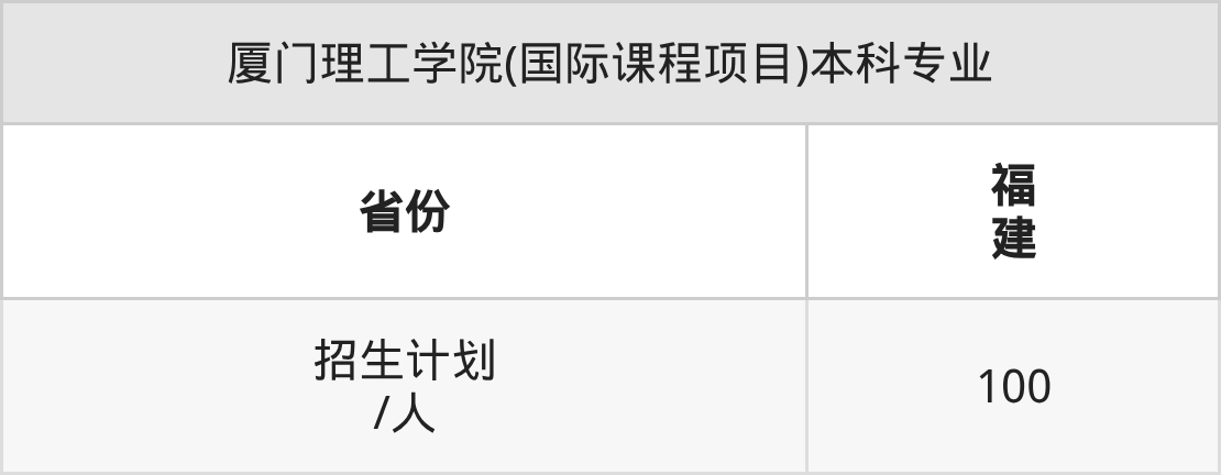 厦门理工学院(国际课程项目)面向福建(100人)开展本科招生。招生批次为本科批。