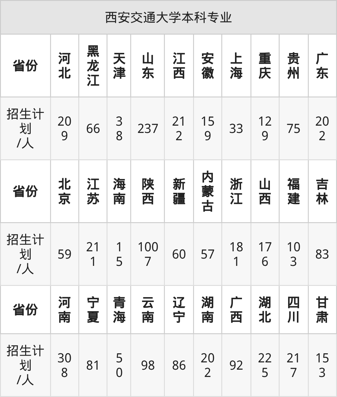 西安交通大学面向广西(92人)、湖北(225人)、贵州(75人)、河北(209人)、海南(15人)、陕西(1007人)、河南(308人)等30个地区开展本科招生。其中新疆招生批次为本科一批,云南、四川、宁夏招生批次为本科批B段,其余省份为本科批。