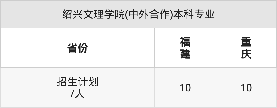 绍兴文理学院(中外合作)面向福建(10人)、重庆(10人)开展本科招生。招生批次为本科批。