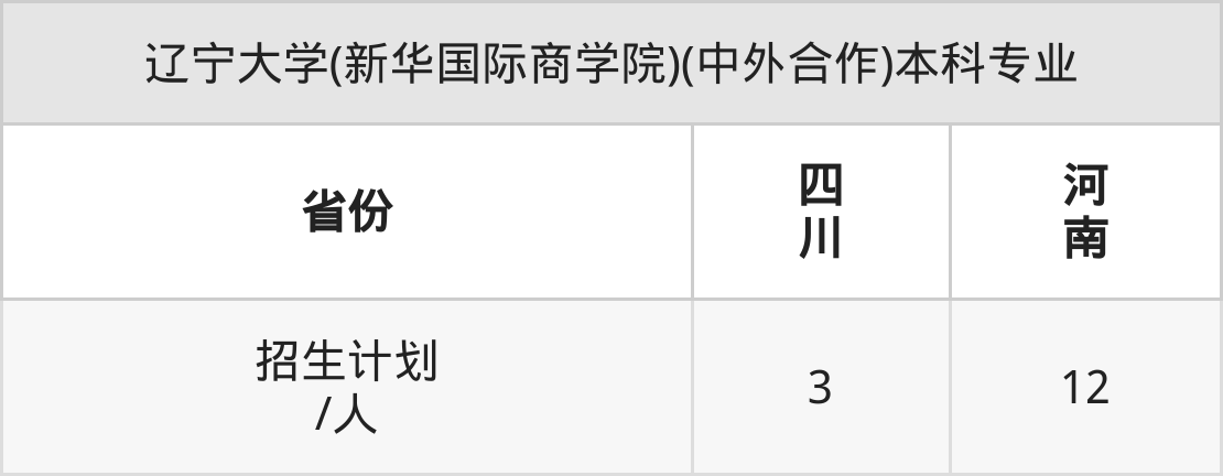 辽宁大学(新华国际商学院)(中外合作)面向四川(3人)、河南(12人)开展本科招生。招生批次为本科一批。
