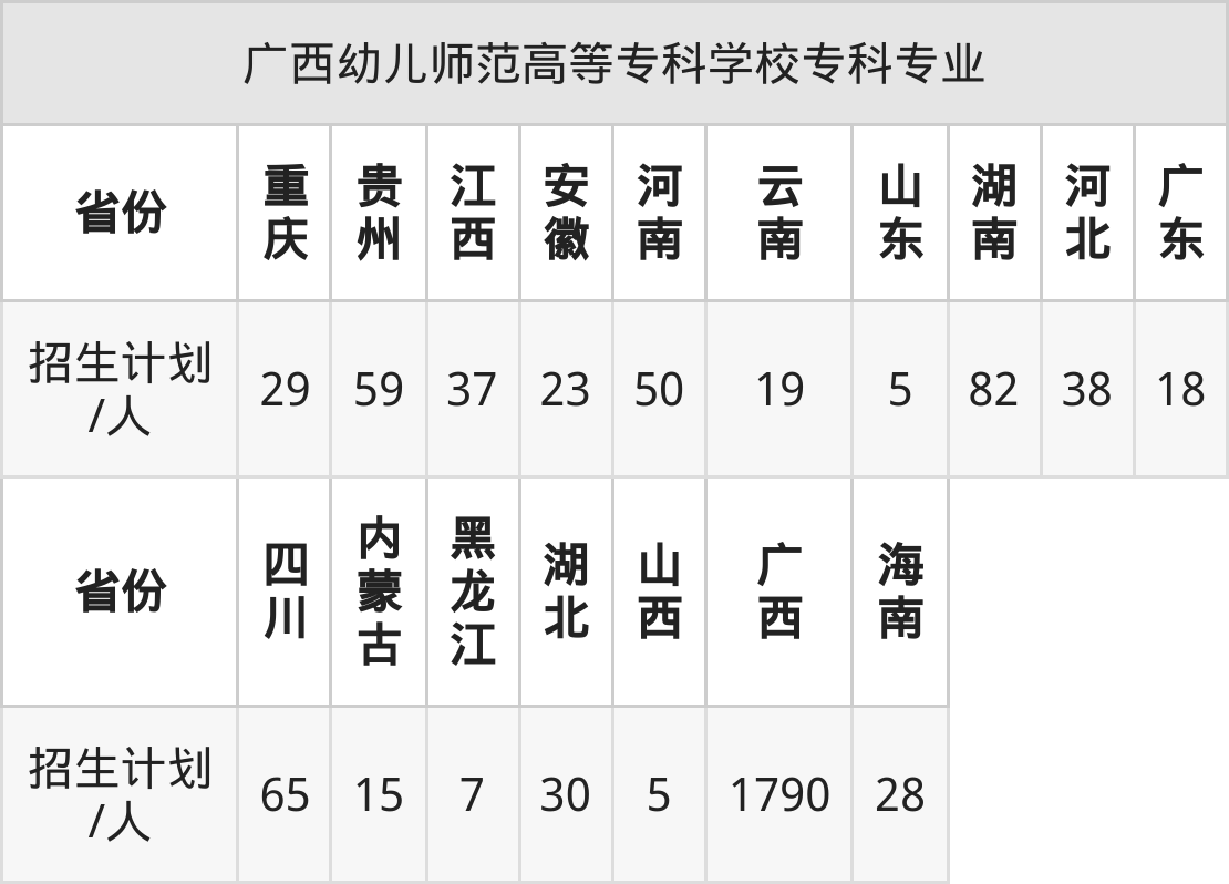 广西幼儿师范高等专科学校面向海南(28人)、贵州(59人)、江西(37人)、山东(5人)、四川(65人)、内蒙古(15人)、云南(19人)等17个地区开展专科招生。其中山东招生批次为二段,其余省份为专科批。