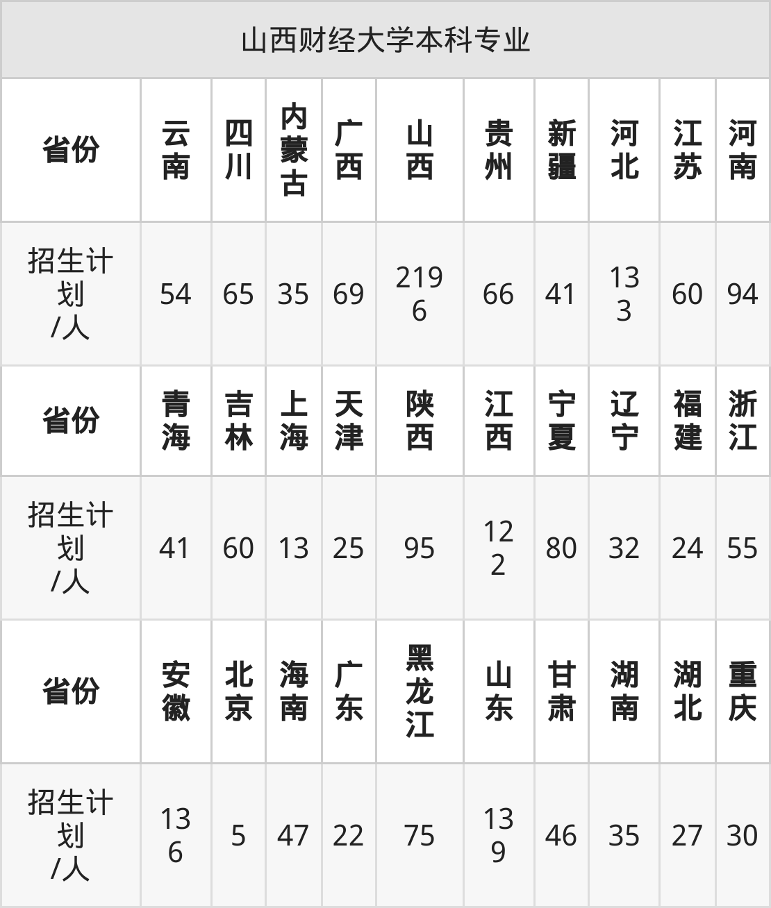 山西财经大学面向重庆(30人)、福建(24人)、新疆(41人)、天津(25人)、上海(13人)、青海(41人)、辽宁(32人)等30个地区开展本科招生。其中宁夏招生批次为第一批本科,四川、陕西招生批次为本科一批,新疆、内蒙古、河南招生批次为本科二批,其余省份为本科批。