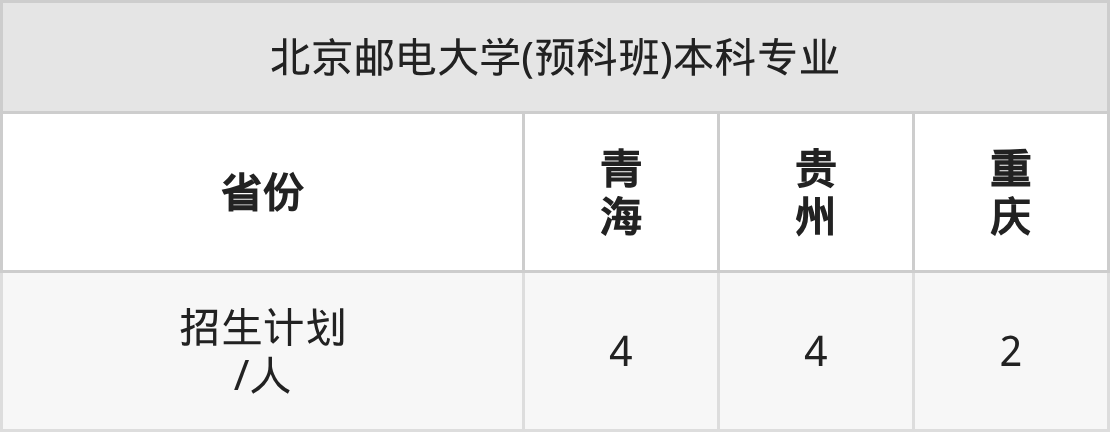 北京邮电大学(预科班)面向贵州(4人)、重庆(2人)、青海(4人)开展本科招生。招生批次为本科批。