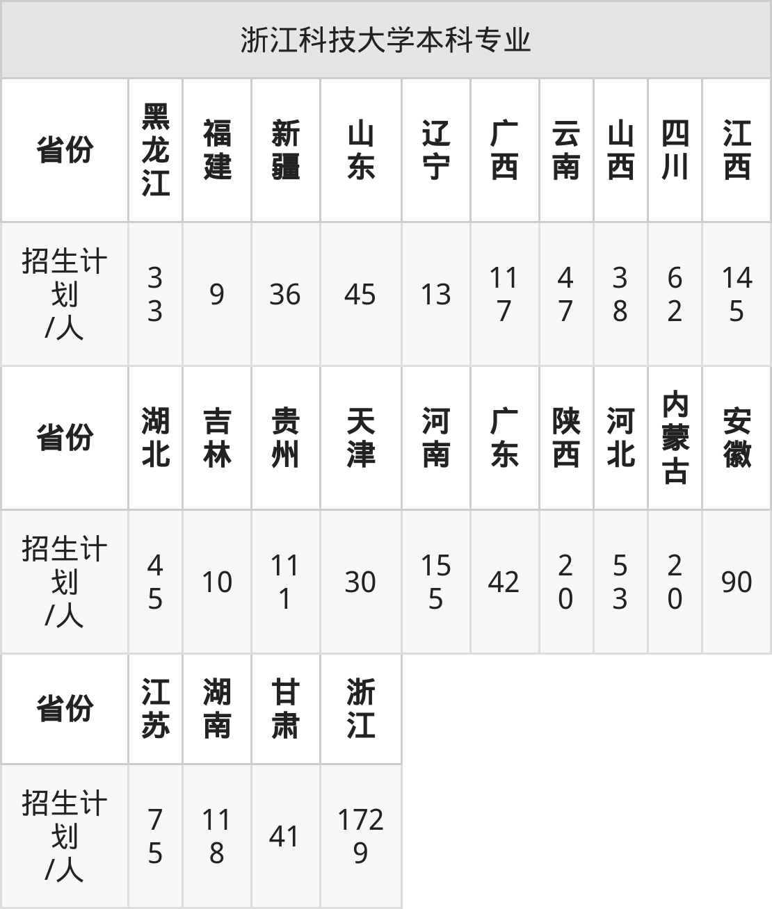 浙江科技大学面向湖南(118人)、安徽(90人)、江西(145人)、吉林(10人)、天津(30人)、广东(42人)、陕西(20人)等24个地区开展本科招生。其中天津招生批次为本科批A段,四川、新疆、陕西、内蒙古招生批次为本科二批,其余省份为本科批。