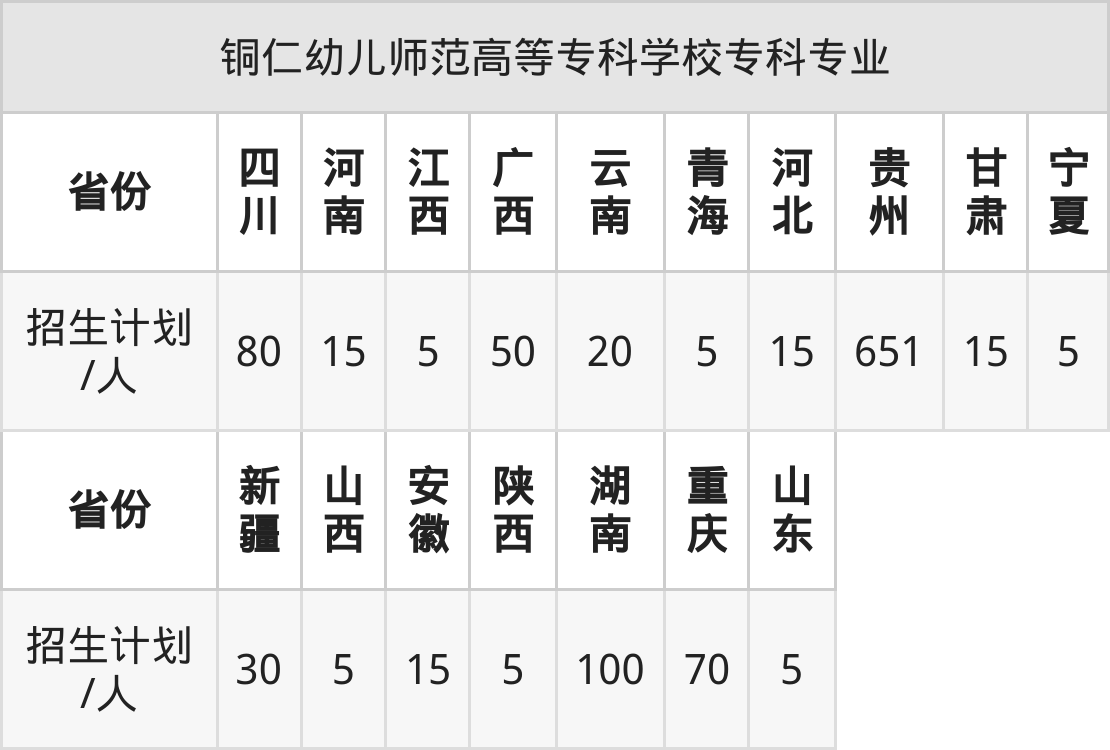 铜仁幼儿师范高等专科学校面向宁夏(5人)、新疆(30人)、江西(5人)、河北(15人)、重庆(70人)、四川(80人)、陕西(5人)等17个地区开展专科招生。其中山东招生批次为二段,其余省份为专科批。