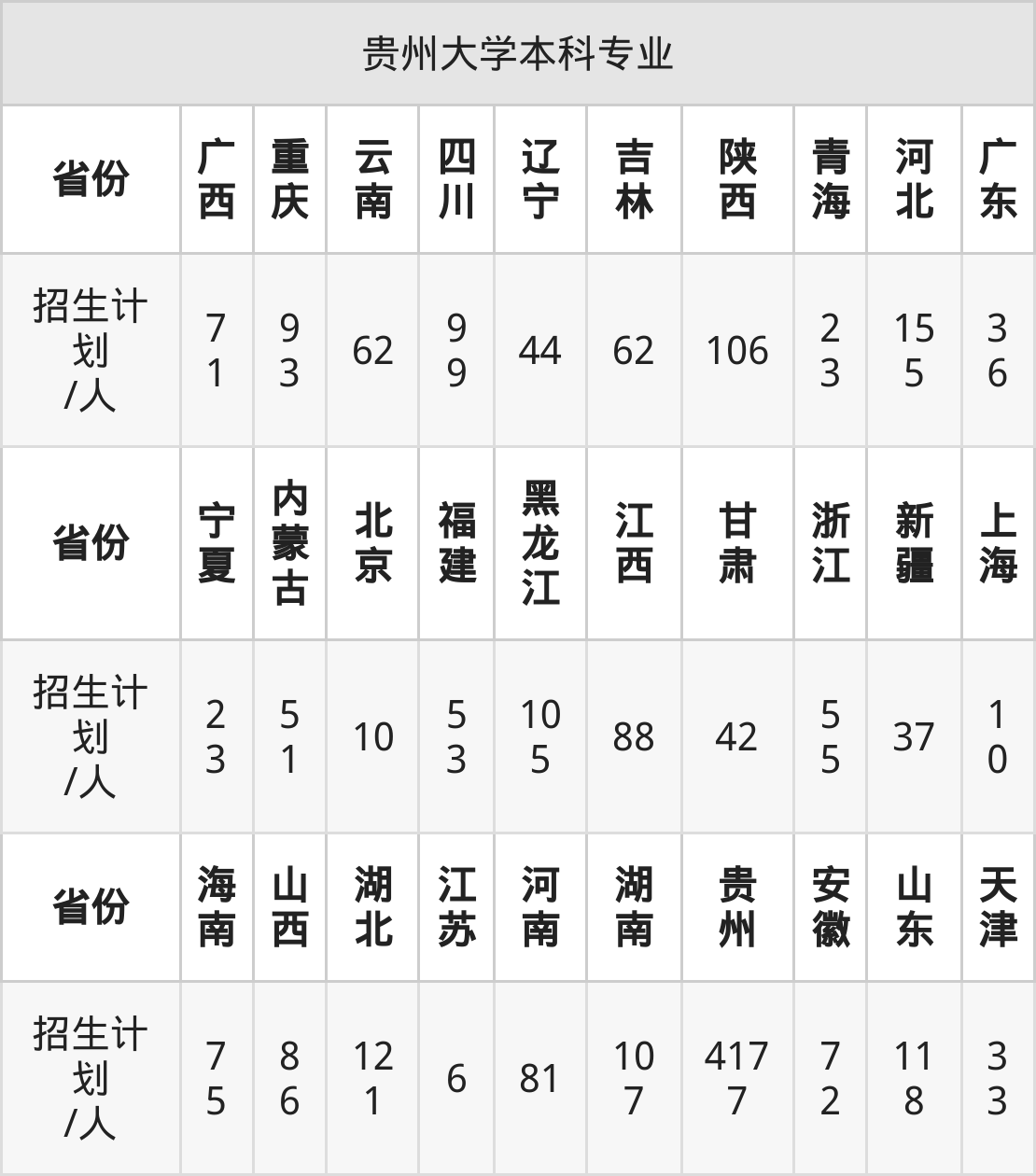 贵州大学面向山西(86人)、江西(88人)、湖北(121人)、山东(118人)、海南(75人)、贵州(4177人)、安徽(72人)等30个地区开展本科招生。其中山东招生批次为一段,河南、内蒙古、陕西、新疆、四川招生批次为本科一批,其余省份为本科批。