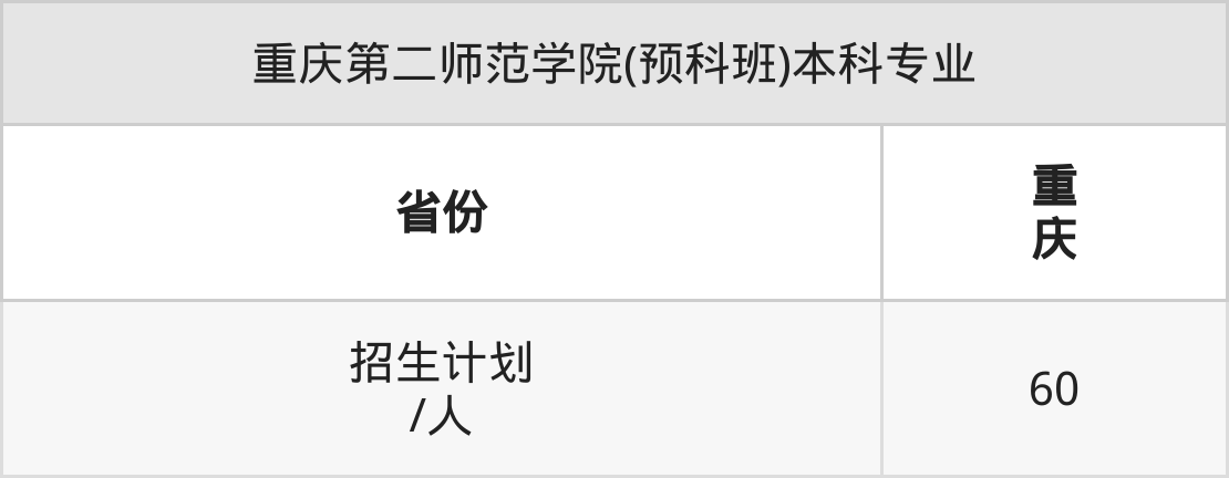 重庆第二师范学院(预科班)面向重庆(60人)开展本科招生。招生批次为本科批。